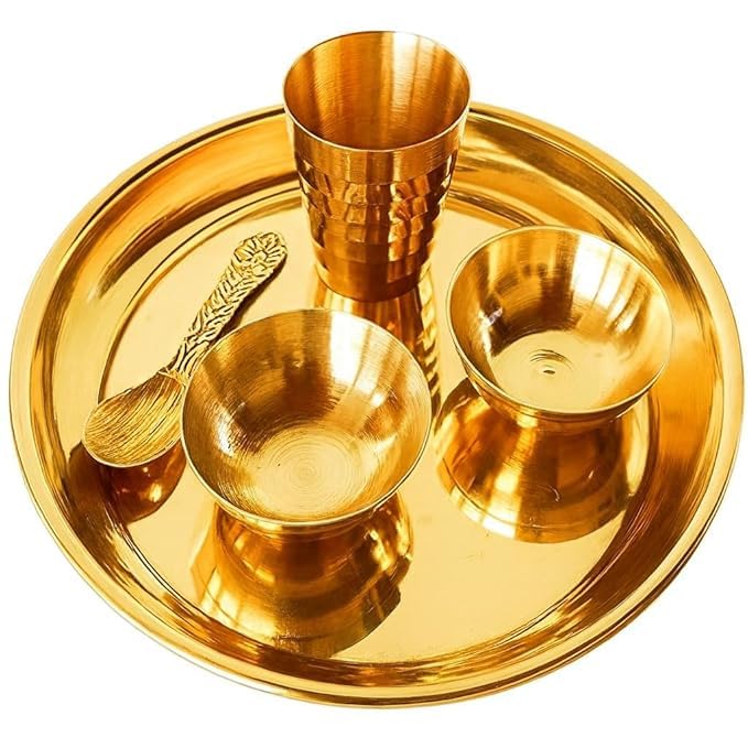 Pooja Thali Set | 5-Piece Traditional Bhog Plate with Spoon, Glass & 2 Katoris | deal for Home, Office, and Temple [Small]